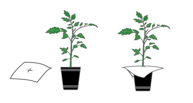 トマトの苗をペットボトルの口から通すときは、クリアファイルなどのすべりやすい素材をカットして苗全体をやさしく包むように巻き、口を通る細さに軽くまとめるのがコツです。