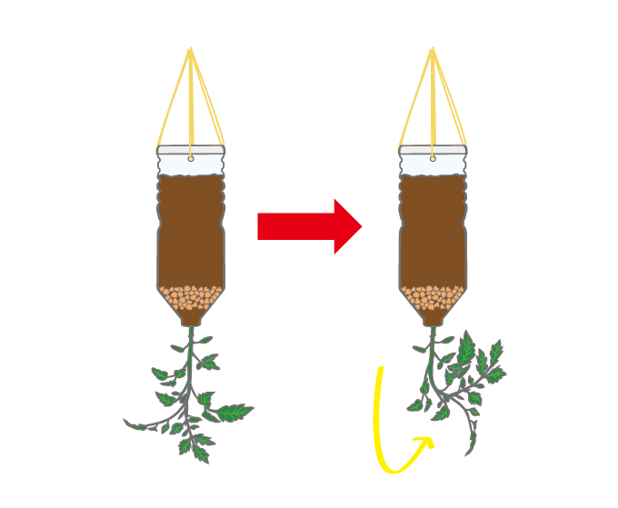 一方、逆さま栽培では、容器を吊るして茎を下に伸ばして育てるため、支柱がいらず、省スペースで楽しみやすい栽培方法です。