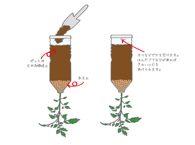 ポット用EM有機培土を、逆さにしたペットボトルへ少しずつ入れていきます。