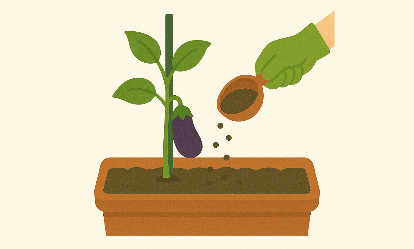 ナス、ピーマン、キュウリなど、栽培期間が長い肥料の要求度が高い野菜は、栽培途中で肥料を定期的に施します。実がつき始めてから2週間に一回施します。